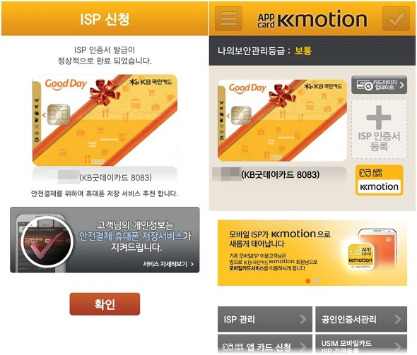 참고로 해당 서비스를 이용하려면 자신의 신용카드가 모바일 안전결제 전문업체인 '브이피'의 제휴사 카드 12종을 가지고 있는지 확인해야 합니다. 모바일ISP는 지원하는 카드가 한정되어 있습니다. BC카드, KB국민카드, 우리카드, 전북JB카드, KJB광주카드, 수협카드, 우체국카드, 새마을금고카드, 상호저축은행카드, KDB산업은행카드, 제주카드, 신협카드만 지원합니다. 다행히 저는 BC카드가 아내는 최근 유출된 KB국민카드가 있어서 우선 등록을 해봤습니다.