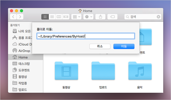 2-3. 다시 파인더에서 command + shift + g 키를 누른 후 다음 경로로 이동합니다. 위와 경로가 비슷해 보이지만 사용자 홈 폴더(~) 안에 있는 라이브러리로 이동한다는데서 차이가 있습니다. ▼