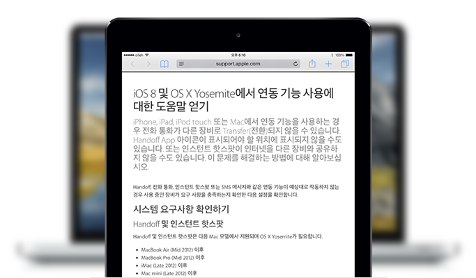 하드웨어와 소프트웨어적인 준비를 마쳤으니 이제 연속성 기능이 실제로 잘 작동하는지 확인할 차례입니다. 맥과 iOS 모두 블루투스가 켜져 있어야 하고, 기능에 따라 서로를 인식하기 위해 같은 와이파이에 연결되어 있어야 하니 이점 참고하시기 바랍니다. 연속성 설정과 문제 해결에 관한 도움말은 애플 고객지원 페이지를 통해 확인할 수 있습니다. ➥ iOS 8 및 OS X Yosemite에서 연동 기능 사용에 대한 도움말 얻기
