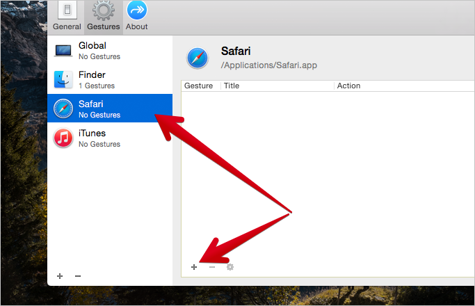 1. 먼저 제스처를 사용할 응용 프로그램을 화면 왼쪽에서 지정한 뒤, 아래쪽에 있는 '+' 아이콘을 누르면 해당 프로그램에서만 작동하는 제스처를 구성할 수 있습니다. 즉, 같은 동작의 제스처라도 프로그램에 따라 전혀 다른 기능을 실행할 수 있습니다. 아울러 'Global' 항목에 제스처를 등록하면 프로그램을 구분하지 않고 동일한 기능을 수행합니다. ▼