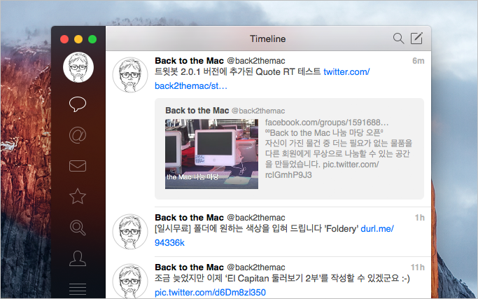 OS X 요세미티풍으로 인터페이스를 새단장하고 성능을 개선하는 한편, 기존 사용자에게 무료로 제공된다는 반가운 소식이었죠. 그리고 오늘 트윗봇 2의 첫 유지보수 업데이트라 할 수 있는 v2.0.1 버전이 나왔는데요. 트위터가 올초에 선보인 '트윗 인용하기' 기능이 새 버전에 녹아들었고, 올 7월에 없어지는 쪽지 140자 제한에 대응하기 위한 준비가 이뤄지는 등 소소한 변경사항을 포함하고 있습니다.