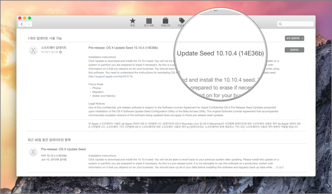 다섯 번째 베타 버전이 지난 10일에 배포됐으니 일주일도 채 되지 않아 새 베타 버전이 나온 셈입니다. OS X 10.10.4 베타 테스트가 시작된 이래 2주마다 한 번씩 새 베타 버전이 나오던 것을 고려하면 조금 쌩뚱맞은 업데이트입니다.