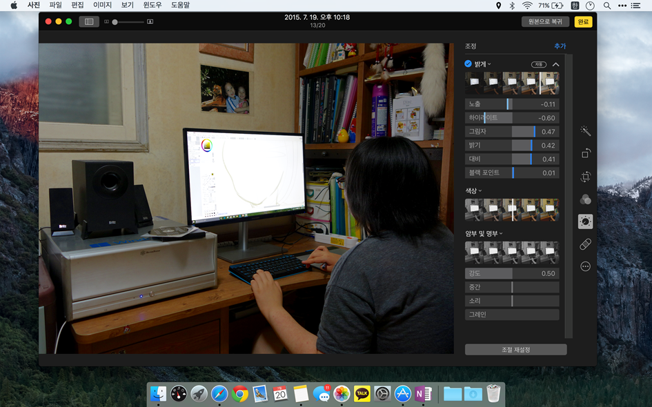 그림자의 값을 높이고 노출이나 밝기 등은 줄여 주었습니다. 노출이 늘어나지 않았기 때문에 모니터의 이미지도 볼 수 있으면서도 전체적을 밝은 느낌의 이미지을 완성 했습니다.