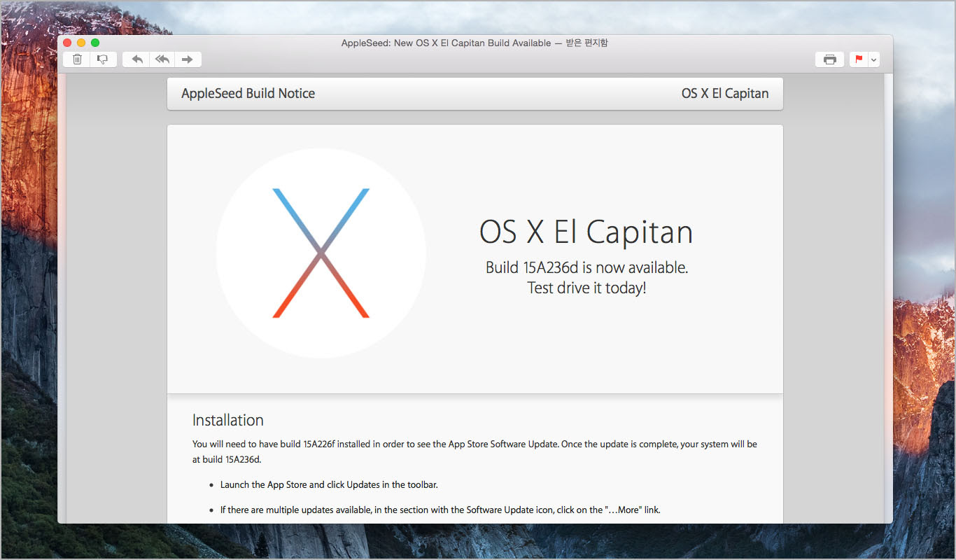 ∙ OS X El Capitan 개발자 베타 1을 설치하기 이전에 수시한 이메일 메시지는 'Proactive Assistant'를 지원하지 않습니다.