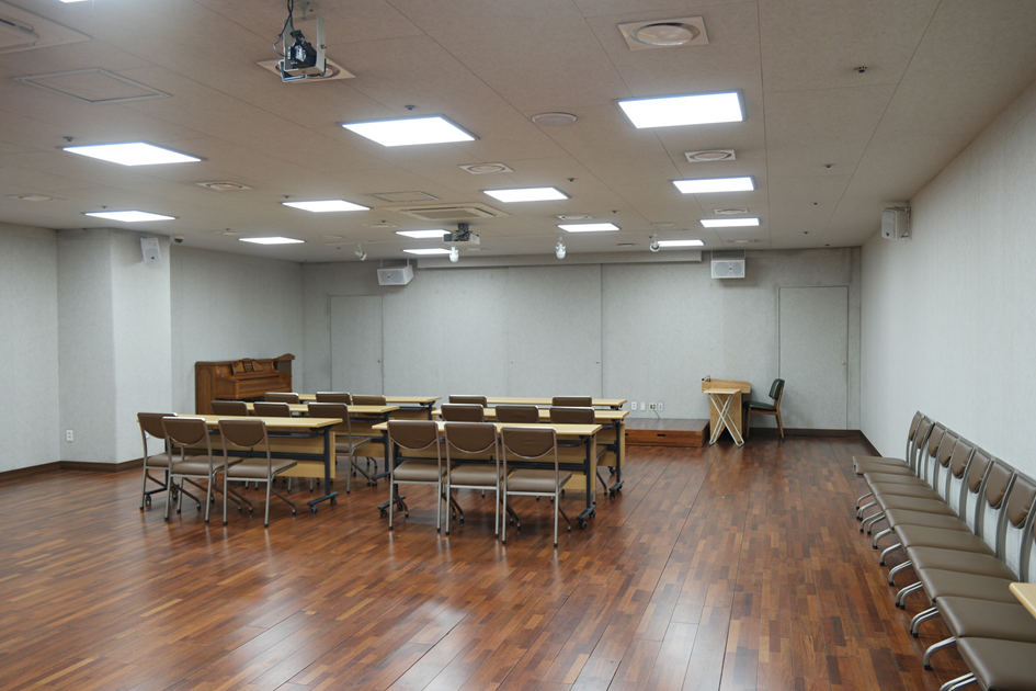 대강당으로 100명 정도 입장이 가능합니다. 교육이나 회의의 규모에 따라 좌석 배치 등을 합니다.