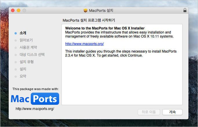 일단 맥포트를 OS X에 처음 설치하는 경우 먼저 맥 앱스토어를 통해 Xcode 최신 버전을 설치한 뒤 맥포트 공식 사이트에서 OS X 버전에 맞는 패키지를 내려받아 설치를 진행하면 됩니다. 만약 맥에 이미 맥포트가 설치된 상태에서 OS X을 업그레레이드 했다면 콘솔에 'sudo port selfupdate' 명령어를 입력해 맥포트 바이너리와 관련 파일만 업데이트하면 됩니다.