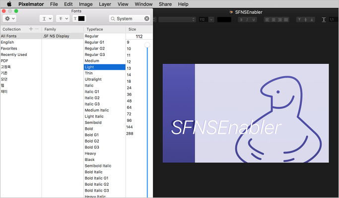 서체 자체가 OS에 설치되어있긴 하지만, 애플이 일반적 방법으로는 못 찾게 꽁꽁 숨겨놨기 때문에 시스템 외의 다른 앱에서 이 서체를 쓸 방법이 없었습니다. 물론, 애플이 개발자들에게 개발 참고용으로 제공을 따로 하고 있기는 하지만 개발자 본인이거나 주변에 애플 개발자가 없으신 분들은 사용할 방법이 없었는데, 이번에 해결책이 나왔습니다.