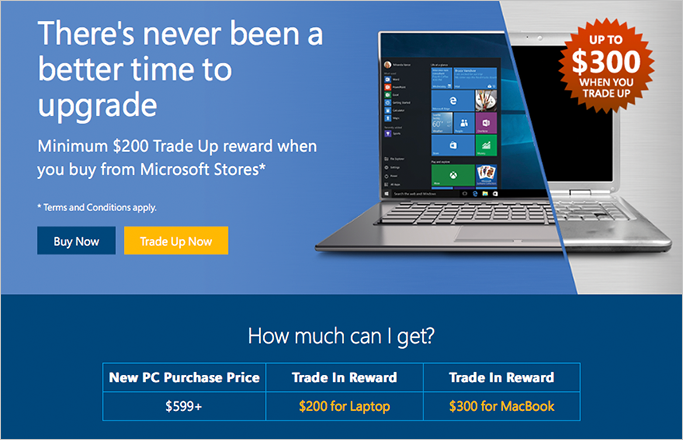 프로모션 제목을 우리말로 의역하면 '손쉽게 더 좋은 기기로 교체하지(trade up)'인데요. 기본적으로 윈도 10이 설치된 최신 PC 구입하면서 MS에 헌 ‘맥북’을 보내면 최대 300달러의 현금을 되돌려 주는 일종의 보상판매 이벤트입니다. 예컨대 600달러짜리 윈도 PC를 구매하면서 쓰던 맥북을 가져가면, 300달러에 윈도PC를 장만하는 셈이 됩니다. 맥북이 아닌 일반 PC를 반납하면 200달러만 되돌려 준다는 점에서 사실상 맥북 사용자를 겨냥한 이벤트라고 봐도 무방할 듯합니다.