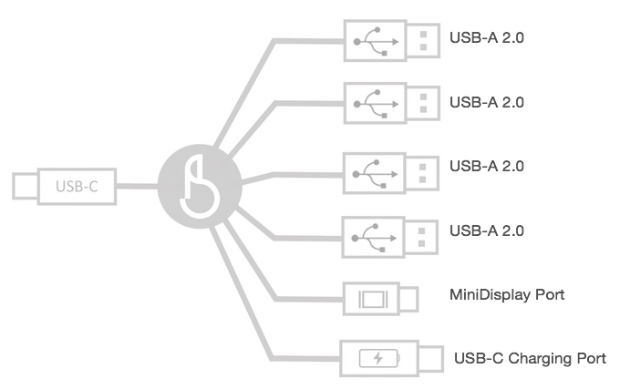 허브 본체에 총 4개의 USB-A 포트와 1개의 미니디스플레이 포트가 준비돼 있습니다. 또 USB-C 단자가 추가로 달려 있어서 주변기기를 쓰는 동시에 맥북을 충전할 수 있다는 장점을 갖고 있습니다. 다만 USB-A 포트는 칩셋 문제로 인해 USB 2.0 속도 밖에 내지 못한다고 합니다. 대용량 저장장치를 쓰는 분들에게는 매력이 조금 미니디스플레이 포트를 통한 영상 출력은 1080p 해상도에서 60HZ 재생률을, 4k 해상도에서 30Hz 재생률을 지원합니다.