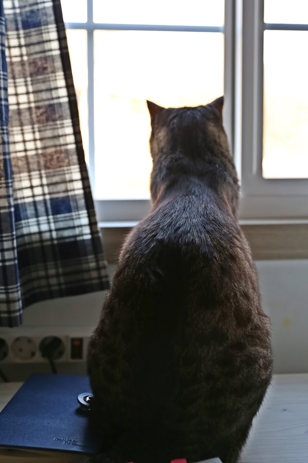 재봉방 창 앞에 재봉틀 책상 위에서 밖을 구경하는 초동이에요~