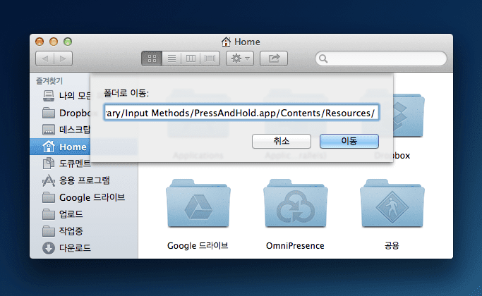 2. 파인더(Finder)에서 command + shift + g 단축키를 누르신 후 다음 경로를 입력합니다. ▼