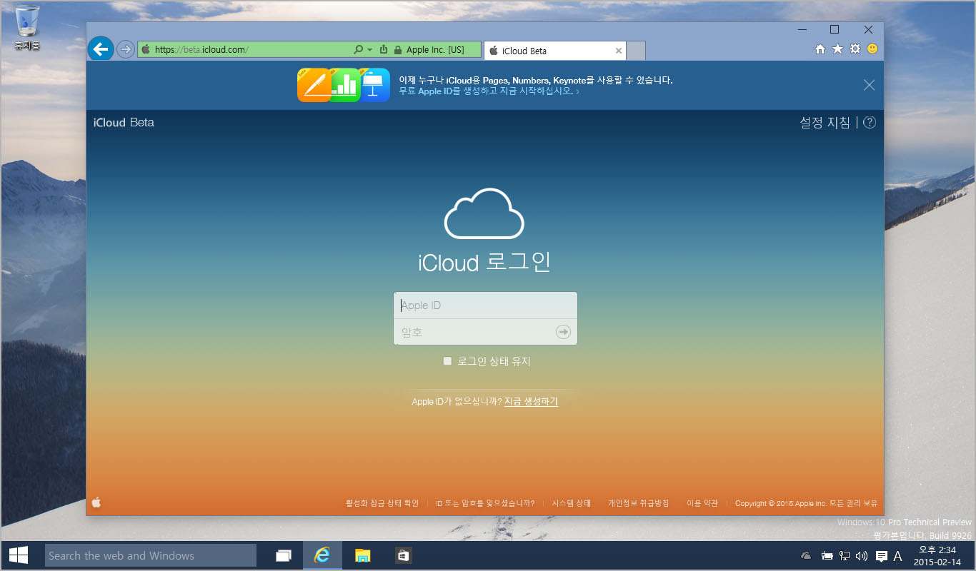 현재 타 운영체제에서 아이클라우드 사이트를 방문하면 애플 ID를 생성할 수 있는 링크가 나타납니다. 이 링크를 통해 애플 ID를 생성하면 곧바로 넘버(Numbers), 키노트(Keynote), 페이지(Pages) 웹버전을 자유롭게 사용할 수 있게 되고, 추가로 문서 저장과 공유를 위한 1GB 상당의 저장공간이 제공됩니다.
