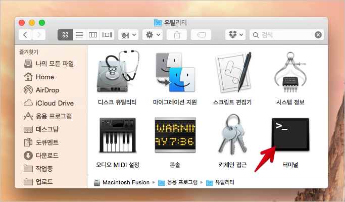 우선 응용 프로그램 ▸ 유틸리티 폴더에 있는 '터미널'을 실행합니다. ▼
