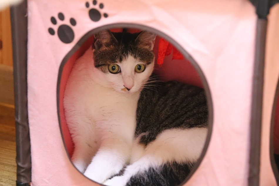 그러더니 더는 쫓지 않고 그냥 스크래쳐 침대에 가서 앉았어요~