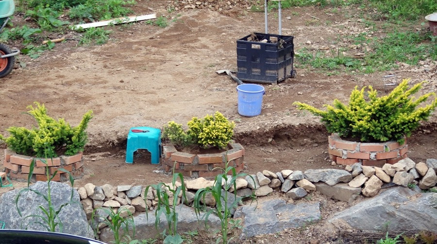 화단과 위쪽 밭의 경계에도 시멘트를 발랐어요..
