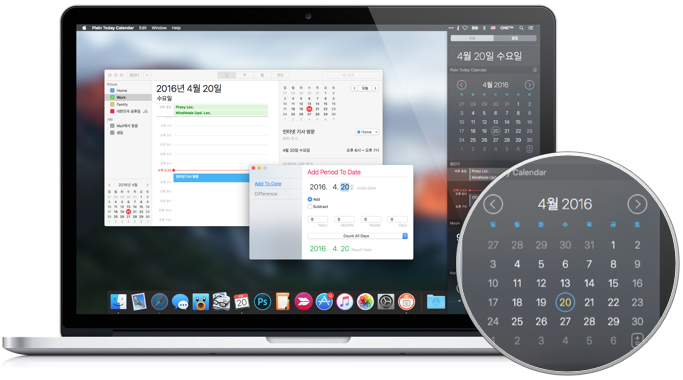 애플 캘린더와 연동되지는 않지만 날짜를 클릭하면 캘린더 앱이 자동으로 실행되면서 당일 일정을 검토하거나 새로 추가할 수 있습니다. 알림센터를 통해 일정을 바로 확인하고 싶다면 OS X에 내장된 '오늘' 위젯이나 '캘린더' 위젯을 같이 띄워놓는 것도 괜찮은 방법입니다.