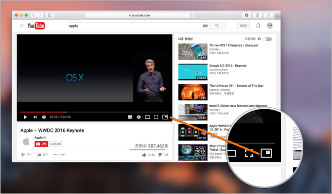 • macOS 시에라, 유튜브 동영상을 '화면 속 화면(PIP)' 모드로 시청하는 방법