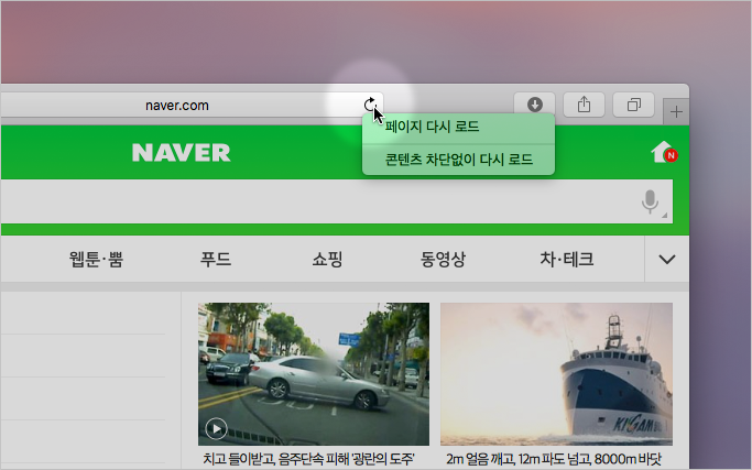 사파리 새로고침 버튼을 1초 정도 꾸욱 누르고 있으면 '콘텐츠 차단없이 다시 로드' 기능을 불러올 수 있습니다. 맥 사용자뿐 아니라 iOS 사용자들에게도 잘 알려진 기능이죠. 이따금 사파리에 설치한 콘텐츠 차단기 때문에 멀쩡한 내용이나 사진까지 차단될 때가 있는데 이때 이 기능을 사용하면 콘텐츠 차단기를 잠시 끈 상태로 페이지를 열 수있습니다. ▼