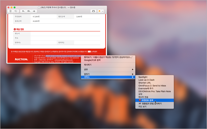 맥에 내장된 기능만으로 제작한 서비스라 별도의 앱을 설치할 필요 없이 쉽고 간편하게 새 우편번호와 도로명 주소를 찾을 수 있습니다. 사용법은 먼저 옛 우편번호나 지번 주소를 드래그해서 선택한 후 마우스 오른쪽 버튼을 누릅니다. 컨텍스트 메뉴 밑에 있는 서비스 항목에서 '📮 우편번호 검색'을 클릭합니다. ▼