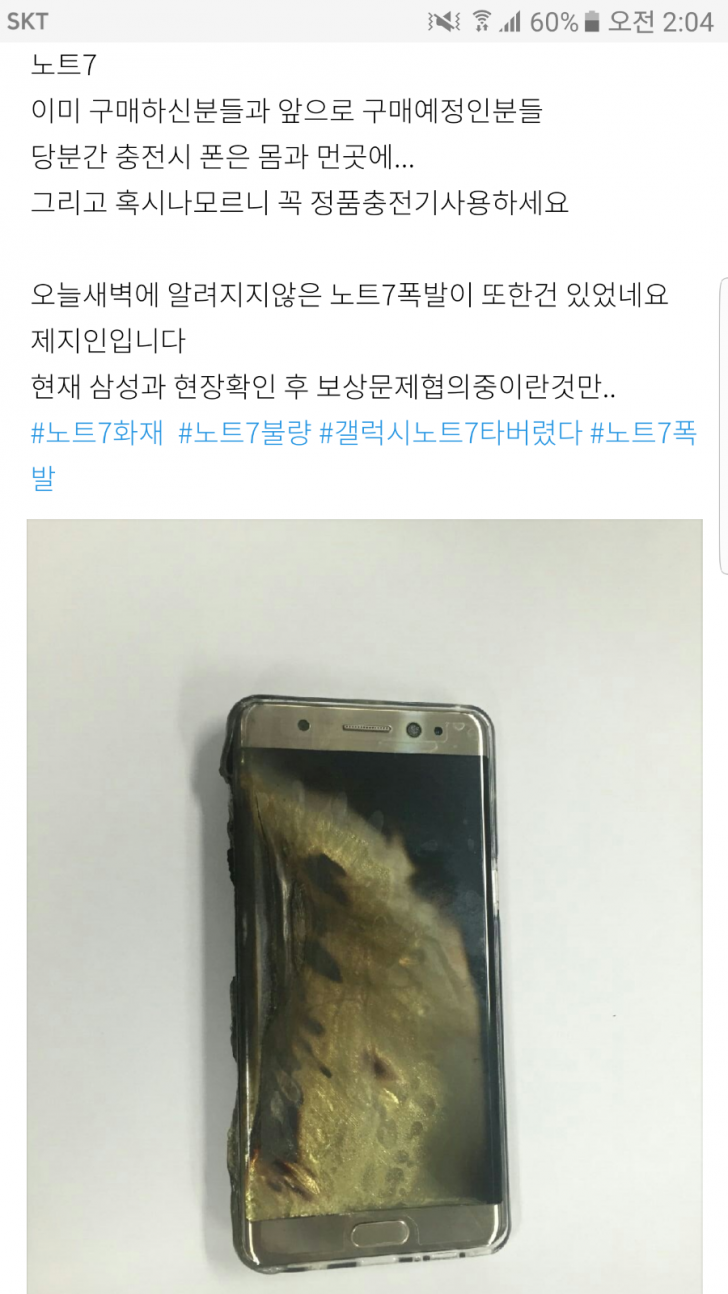 <첫번째 폭발한 갤럭시노트7 관련 SNS 글>