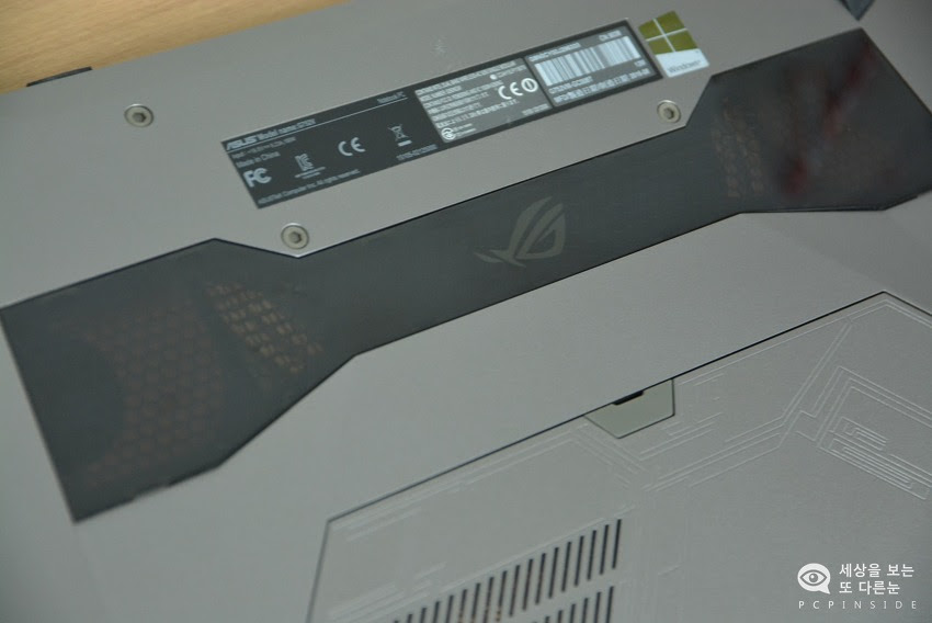 오히려 이 제품은 하판이 재미있습니다. 사실 밑면은 거의 신경을 쓰지 않는 부분인데요. SF영화에서나 볼 수 있는 묘한 문양과 함께 마치 튜닝한 제품처럼 반투명한 아크릴 판을 사용해서 노트북 내부를 확인할 수 있도록 꾸몄습니다.