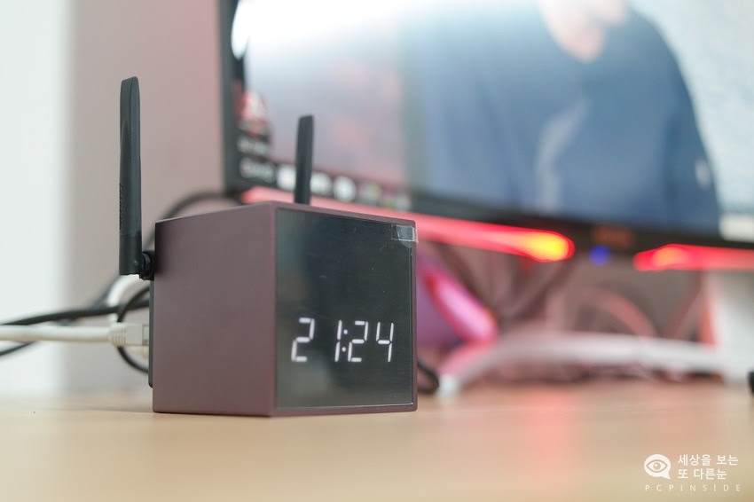 바로 이 녀석입니다. 가로, 세로, 높이 약 7cm 정도의 작은 정육면체 디자인을 하고 있으며 무선공유기 역할을 위한 2개의 안테나가 달려있습니다. 특히 전면에는 시간을 알려주는 디지털 시계가 내장되어 있어 탁상시계로도 활용할 수 있습니다.