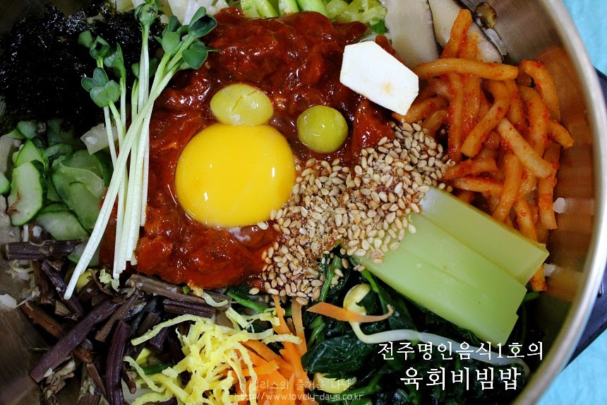 전주 비빔밥은 소고기가 익혀서 나가지만, 육회비빔밥은 육회가 들어갑니다. 그래서 3천원 정도 더 비싸고요, 보시다시피 기본적인 비빔밥 재료치고는 상당히 알차게 많이 들어있습니다.