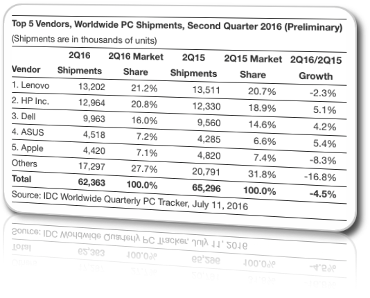 International Data Corporation (IDC)가 지난 11일(현지시각), 2016년 2분기(2Q) 전 세계 PC 출하량에 따른 점유율을 조사한 통계자료를 통해 , 애플은 출하량 감소에 따른 시장 점유율 하락으로 4위를 기록한 ASUS에 이어 5위에 기록되었다고 밝혔습니다. ▼