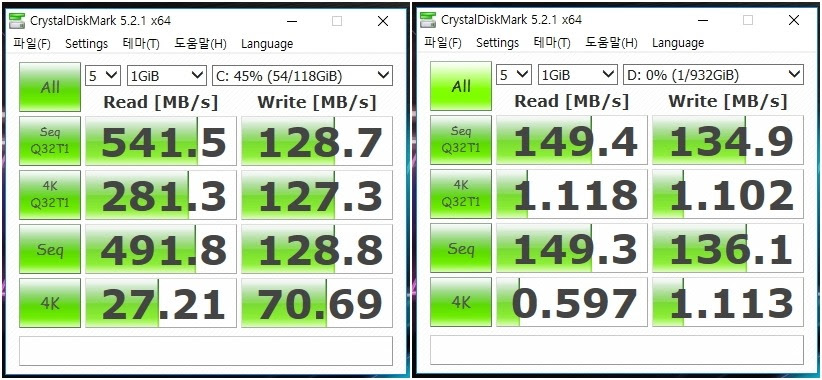 SSD 성능을 측정할 수 있는 Crystal Disk Mark5 입니다. 읽기 성능은 괜찮은 편인데 쓰기 성능이 다소 떨어지네요. 참고로 1TB HDD도 함께 탑재했는데요. 고사양 게임의 용량이 상당히 큰 만큼 1TB의 저장공간은 필수가 아닐까 합니다.