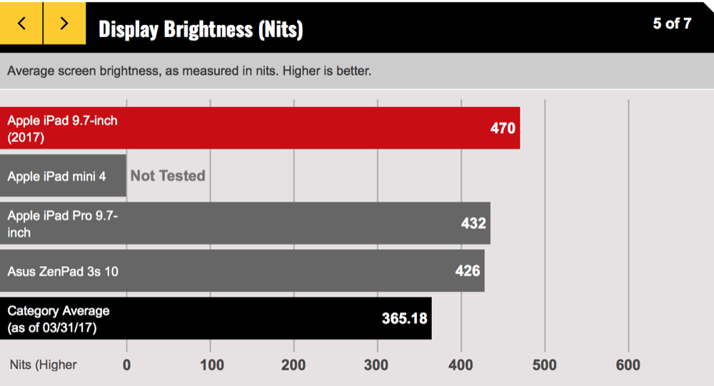 반사율이 높아지면 주변광이 강할 때 화면의 가독성이 떨어지게 된다. 또, 커버글라스와 디스플레이 사이에 에어갭이 있으면, 커버글라스가 디스플레이에서 출발한 빛을 일부 반사시키기 때문에 이 역시 가독성을 떨어뜨리는 요인이 된다. 새 아이패드는 이 문제를 해결하기 위해 아이패드 에어 2에 비해 더 밝은 디스플레이를 탑재했다. Laptop Mag에 따르면 새 아이패드 프로는 최대 470 nits의 밝기에 도달할 수 있는데, 이는 아이패드 프로 9.7인치 모델의 최대 432 nits의 밝기에 비해서도 더 밝은 것이다. 거기에 더해 새 아이패드의 디스플레이 품질 자체도 개선된 것으로 보인다. Laptop Mag이 측정한 색 정확도 정보에 따르면 새 아이패드의 디스플레이는 Delta-E 테스트 결과 평균 0.18의 스코어를 기록했다. Delta E는 색 좌표상에서 두 색간의 거리를 나타내는 것으로, 스코어는 미리 지정된 표준 색과 실제 화면에 표시되는 색 사이의 차이를 나타내는 것이다. 당연히 이 차이가 없는 것이 이상적인 디스플레이고, 이 값은 낮을 수록 좋다. 새 아이패드가 기록한 0.18의 기록은 아이패드 프로 9.7인치의 1보다 더 높은 값이며, 아이패드 프로 9.7 모델이 아이패드 에어 2보다도 더 높은 색 정확도를 갖고 있는 것을 감안해 볼 때 이는 놀라운 수치이다.