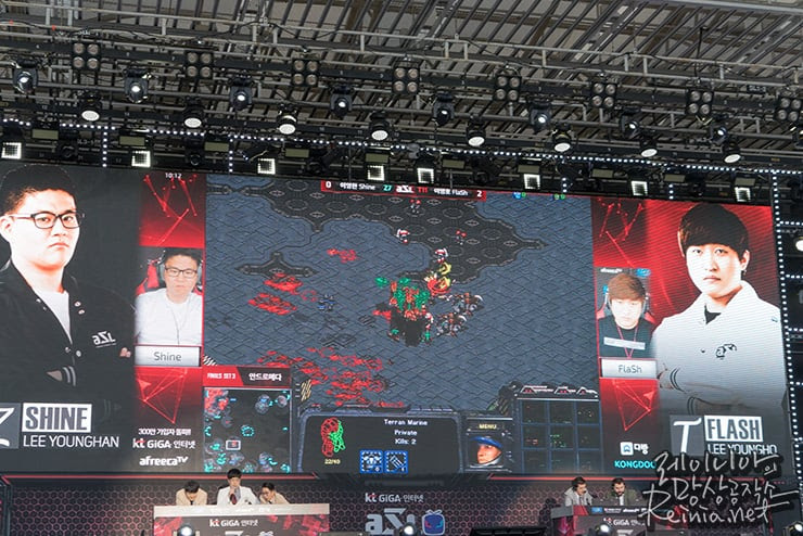나이더스 커널로 확장기지와 본진을 엮어 유기적으로 병력을 활용했지만, 압도적인 화력으로 밀어붙여 결국 2경기도 이영호 선수가 가져가더라고요. 중간중간 사진을 찍으려고 했는데, 마지막엔 긴장해서 보느라 사진도 제대로 찍지 못했습니다.