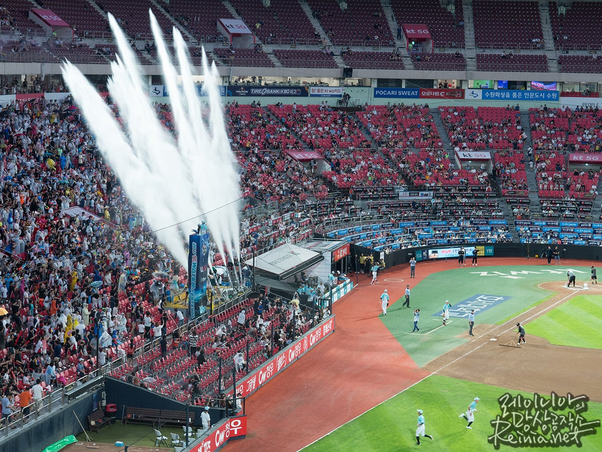 1회부터 서로 점수를 내면서 경기를 시작했습니다. 워터 페스티벌 중에는 홈런이나 득점 등 경기 상황에 따라 5G 캐논이라 이름 붙은 물대포를 시원하게 쐈는데요. 그리고 응원석에서 위즈 샤워라는 이름으로 또 시원하게 물대포를 발사했습니다.