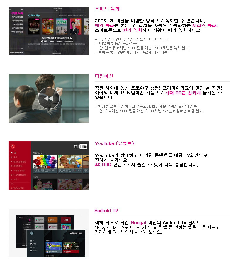 2018년 평창 동계 올림픽과 월드컵이 열리는데요. 실시간, 예약, 원격 녹화 기능은 물론 음성인식 기능 등을 활용해 놓치지 않고 원하는 경기를 즐길 수 있지 않을까 합니다. 여기에 구글 음성인식 서비스와 UHD 화질의 유튜브 서비스 이용은 더욱 편리하고 폭넓은 콘텐츠 활용이 가능해질 듯 합니다.