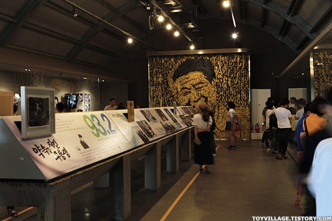 무릎을 구부려 몸을 낮추고... 같이 사진찍는 사람들을 배려하셨던 노무현 대통령의 생전 모습이 입간판으로 서있다. 많은 사람들이 함께 사진을 찍고있었고, 옆의 천진한 아이는 노무현 대통령의 포즈를 흉내내 보기도한다.