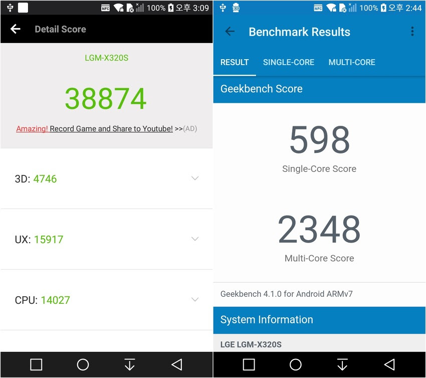 X500은 X400과 동일한 미디어텍 MT6750 1.5GHz 옥타코어, 2GB RAM을 탑재했습니다. 즉, 거의 유사한 성능을 보여줄 듯 한데요. 실제로 Antutu와 Geekbench4 벤치마크 앱을 돌려봤습니다.
