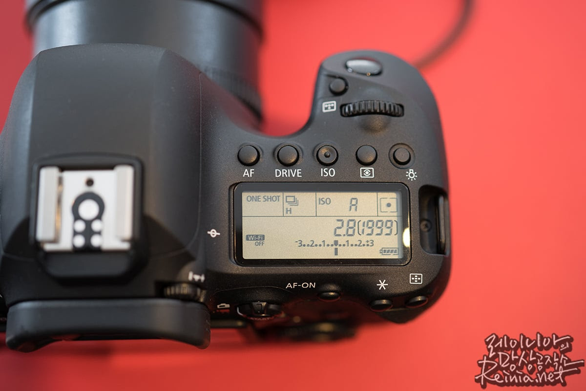왼쪽에는 모드 다이얼이, 오른쪽에는 보조 디스플레이와 다양한 조작 버튼이 모여있습니다. 한 손으로 쥐고 조작하기 좋게 버튼이 모여있는데요. 저는 캐논의 조작방식이 익숙하지 않아 조금 헷갈렸지만, 기존에 캐논, 그리고 6D를 쓰셨다면 익숙하게 느껴지시리라 생각합니다.